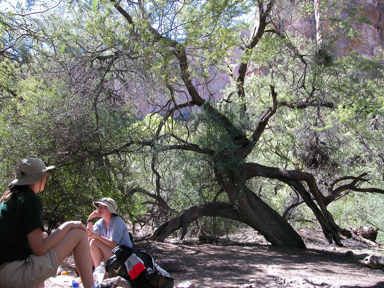 Beyond this central intersection was a forest of gnarled mesquite, and we selected a horizontal trunk to rest. A couple of times we could hear the voices of hikers down by the stream. Here at Horse Camp, the midpoint of the canyon, there’s room for hundreds of campers, though the established wilderness limit is 50 on any given day. Somewhere nearby are the ruins of a cabin.