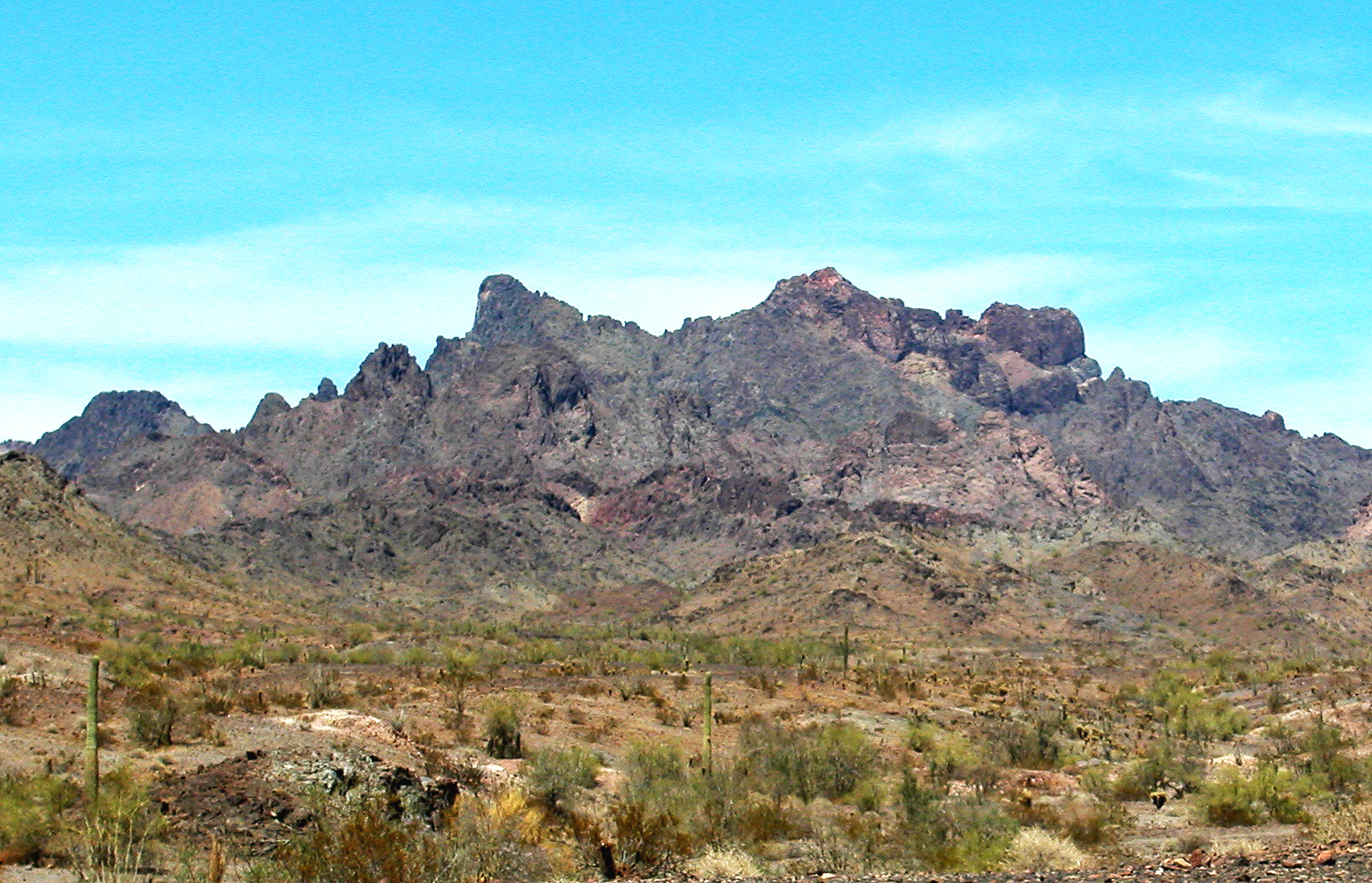 All around us lay the impassible ruggedness of the Castle Dome range, and a few miles to the west squatted the titular peak itself. I mused that the mountain’s name really shows its split personality: from the south it looks like a giant fortress, but from the east it really is a dome. And from this side the prominent finger, invisible from Yuma, is in sharp profile.