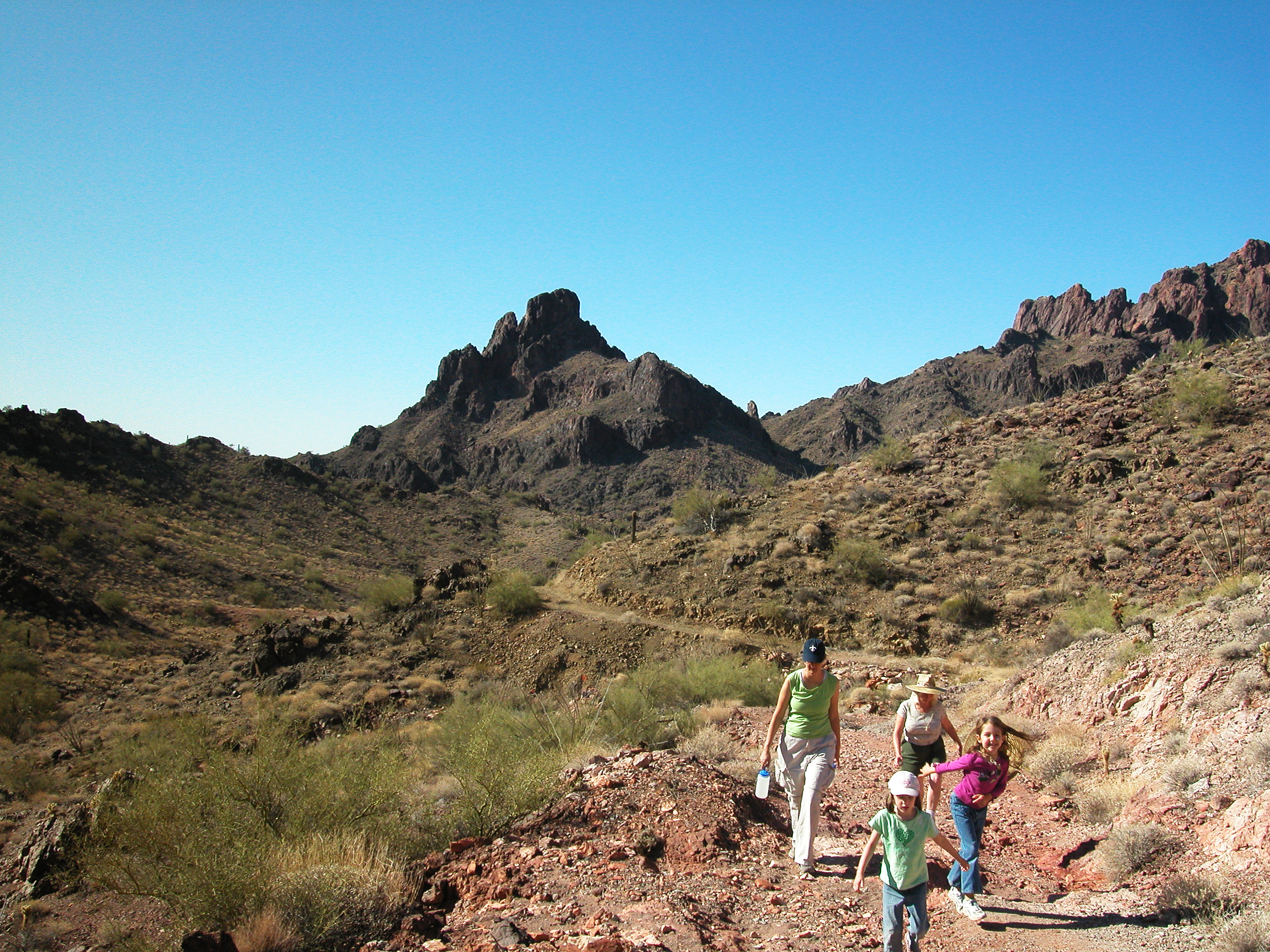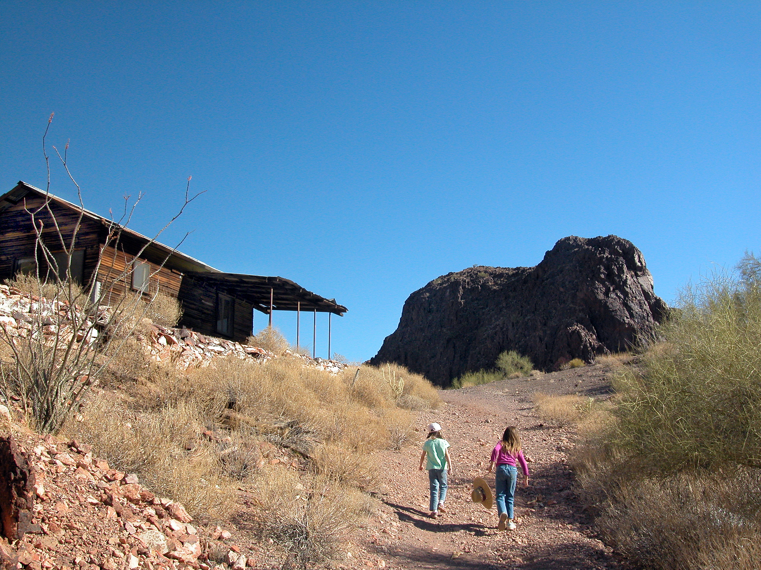 In place of the hard scramble down, though, we had our sights on the near mountain peak to the left. We followed the trail back up to a concrete cistern that had caught the rare rivulets of precious water from the draw. Then we continued up past the lips of several gaping shafts, being careful to keep a firm grip on the kids.