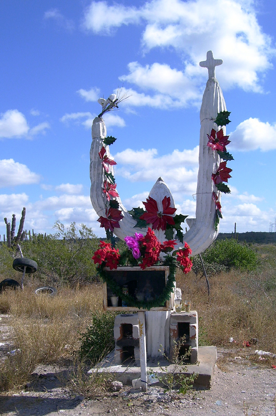 Mexican Hwy 1 follows the ocean from San Quintin to El Rosario, then climbs to a plateau and heads inland across the desert. From here on, this solitary paved artery has a consistent quality: that is, the roadway is a narrow two-lane with absolutely no shoulder; and it’s built up, with ditches about six feet deep on both sides. To ensure the drivers’ vigilance, the entire journey is punctuated with colorful roadside shrines for the travelers who have met their end along the dangerous route.