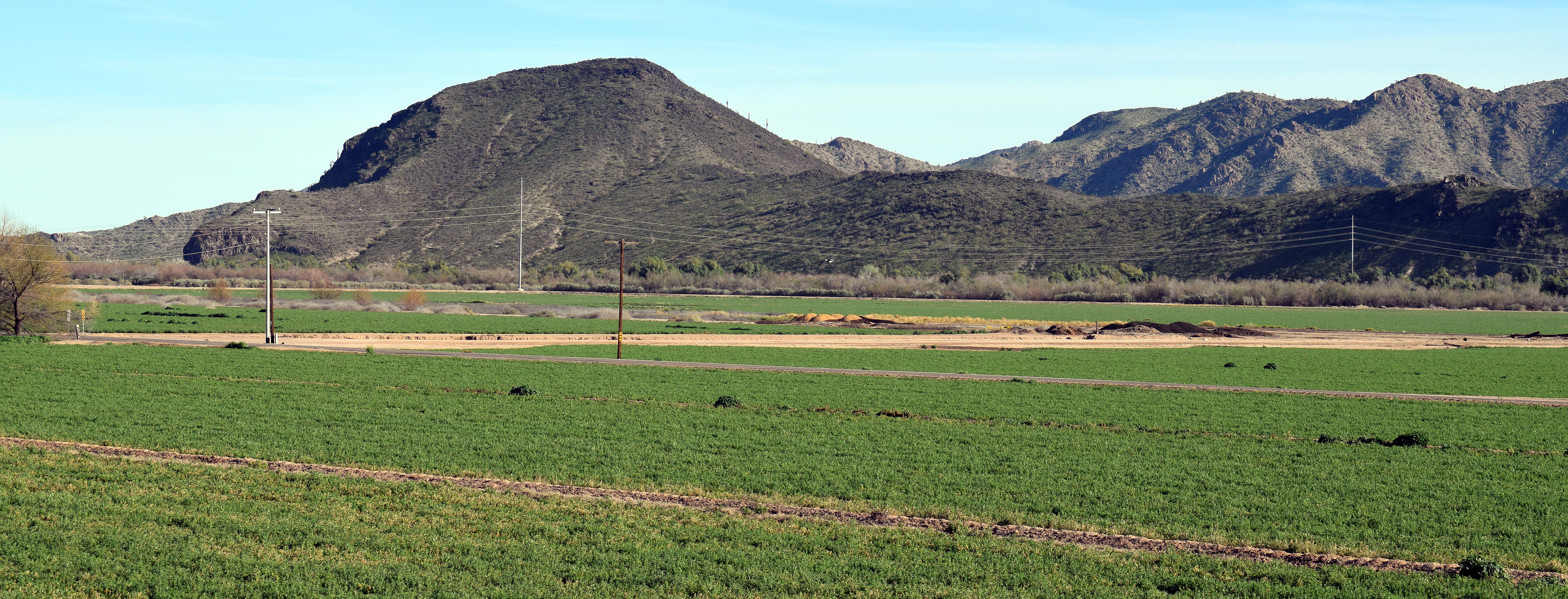 Leading north from the dam, the highway dips among more fields. Behind them are the shrub-choked riverbed and, beyond, the crumbling granite of Buckeye Hills.