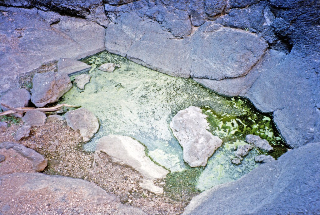At long last, we set up camp next to the tanks but were disappointed to find them mostly depleted, the deepest of them shrunken to a puddle of green scum. This cluster, which lies at the tail end of the lavas, is shallower and more exposed than the Emilia group high on the northern slope. I also remember reading that some of the tanks have long since been drained and contaminated by the free-ranging cattle.
