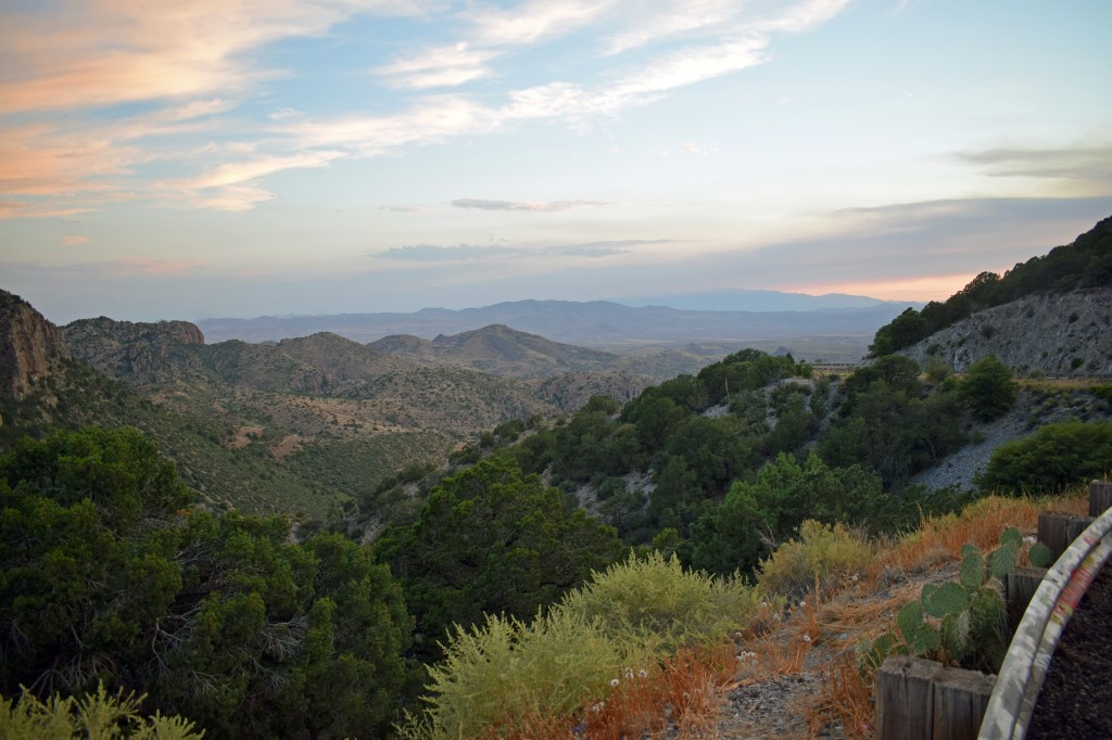 U.S. 180 took us back past the Alma Trading Post, the (closed) Aldo Leopold Vista and the face of the Mogollon Mountains, bathed this time in the golden glow of sunset. However, Route 78 along Mule Creek was new to both of us. Just at sundown, we descended through the canyon where the creek falls out of the highlands to the desert floor, on its way to meet the Gila at Three Way.