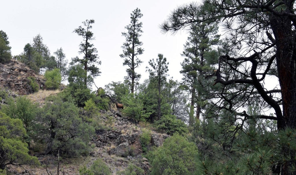 From the confluence, the trail up the Creek was faint, marked at intervals by pink ribbons tied to the trees. A short ways along, Lori somehow spotted an elk buck high above us on the slope – a place where we probably could have descended from the mesa the day before. He was motionless between a couple of junipers, regarding us with the same intense interest as we did him. He had no rack, but his body was massive – far out of proportion with his head, like some fantasy creature out of Japanese anime.