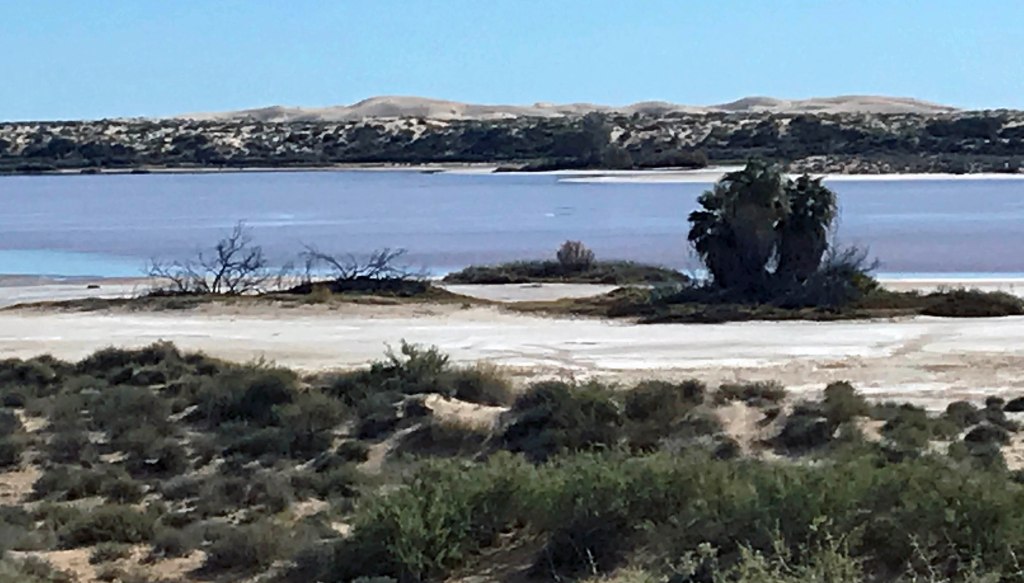 It was a long stretch, a blur of unbroken desert, with the higher points of the big island shifting in and out of view, until we again met the coast at Puerto Libertad. East of town along the highway lay a couple of vast solar arrays, with cleared land around them that suggested plans for expansion.
